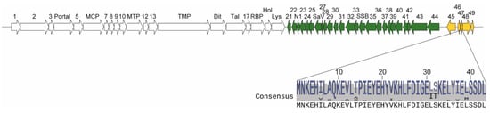 Phage p2 genome, orf47 location and ORF47 consensus sequence. The genes are represented by arrows and numbers. Early-expressed genes are in green, middle-expressed in yellow and late-expressed in white. The consensus amino acid sequence of ORF47 in 184 publicly available Skunavirus genomes is shown (see Figure S1 (Supplementary Materials) for alignment). MCP: Major capsid protein, MTP: Major tail protein, TMP: Tail tape measure protein, Dit: Distal tail protein, Tal: Tail associated lysin, RBP: Receptor binding protein, Hol: Holin, Lys: Lysin, SaV: Sensitivity to AbiV protein, SSB: Single stranded binding protein.