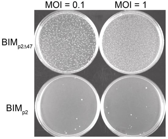 We infected L. lactis MG1363 with phage p2 or p2∆47 and over incubated the plates to study the natural emergence of phage-resistant colonies (BIMs; bacteriophage-insensitive mutants). Our data clearly showed that fewer bacteria survived infection by phage p2 compared to infection by p2∆47 (Figure 3).