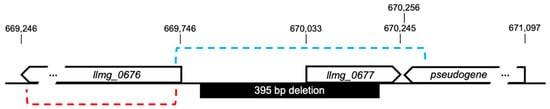 Next, we hypothesized that the 395 bp deletion might interfere with the expression of gene llmg_0676 encoding a hypothetical acetyltransferase (A2RJ27) located 56 bp upstream of the deletion (Figure 4). Using CRISPR-Cas9, we knocked out gene llmg_0676 and the expected deletion in the resulting clone MG∆0676 was confirmed by PCR and sequencing. We then checked for phage resistance by comparing the p2 and p2∆47 titers on the recombinant strain MG∆0676 and on the sensitive L. lactis MG1363. The phage titers were the same with both bacterial strains, implying that the inactivation of llmg_0676 is not responsible for the resistance to phage p2∆47 in BIMp2∆47. The mechanisms by which BIMp2∆47 develop resistance to phage infection remain to be elucidated.