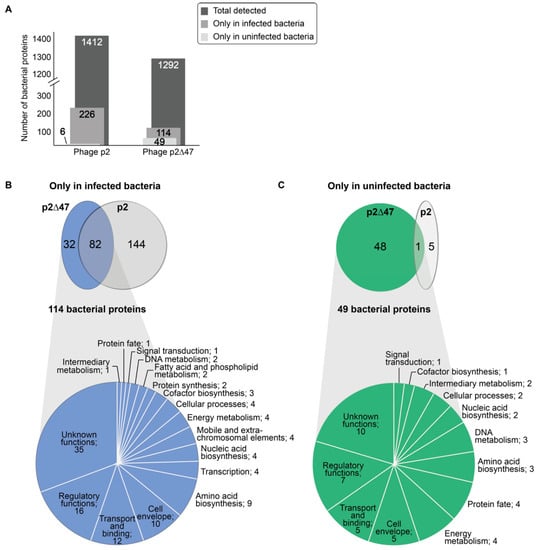 Interestingly, deletion of the gene coding for the low-abundance protein ORF47 had a major impact on the bacterial proteome during phage infection. Previously, 1412 bacterial proteins were detected in our proteomic analysis of L. lactis MG1363 []. Among these proteins, 226 were detected only during phage p2 infection while 6 were detected strictly in uninfected cultures []. Here, a total of 1292 bacterial proteins were detected with phage p2∆47 infecting L. lactis MG1363. The number of bacterial proteins detected only in p2∆47-infected L. lactis MG1363 cultures fell to 114, while the number of bacterial proteins detected only in uninfected cultures rose to 49 (Figure 5A).