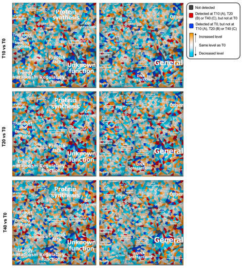 Voronoi treemaps depicting the proteotypes of L. lactis cells during phage p2∆47 infection. Each cell represents a single gene locus grouped with other functionally related elements. Metabolic pathways assigned to gene loci are based on TIGRRoles (left panel) and TIGR subroles (right panel). Proteins were determined at 10 (T10), 20 (T20) and 40 (T40) minutes post-infection and compared with uninfected cultures (T0). Expression data were visualized using a color gradient. Colors of the range blue means a protein expression level lower than in uninfected cultures (T0), white means equal to T0, and orange means higher than T0. For higher resolution images of the subroles treemaps (right panel), see Figures S5–S7 (Supplementary Materials).