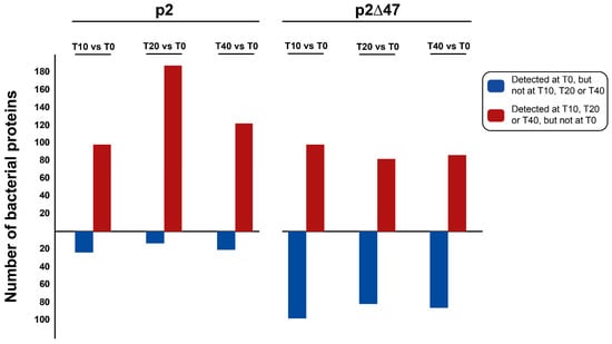 The proteomic analyses of phage infections were conducted as previously described []. Briefly, time-course infections of L. lactis MG1363 by phage p2∆47 were performed in biological triplicate. Sample T0 (negative control) was collected just prior to adding the purified phage p2∆47 at a MOI of 5. Samples T10, T20 and T40 were collected 10, 20, and 40 min post-infection, respectively. Proteins were extracted and separated by 1D SDS-PAGE (12% polyacrylamide) for in-gel tryptic digestion. Tryptic peptides were separated by liquid chromatography (LC) using an EASY-nLC II system and measured on an Orbitrap Velos instrument. For GeLC-MS/MS, relative protein quantification was achieved using the MaxQuant software (version 1.6.0.1) and the Andromeda plug-in. Proteins were accepted if at least two unique peptides could be identified in at least two of the three biological replicates (filtered in Perseus, version 1.6.0.2.) (Supplementary Table S3). Statistical analysis (ANOVA) was performed using TM4 where p-values ≤ 0.01 were considered significant (Supplementary Table S4). For classification and visualization purposes, all L. lactis MG1363 proteins were assigned a TIGRFAM functional role (TIGRRole) [].