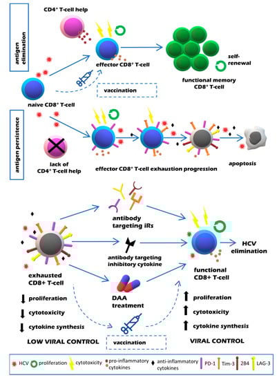 Aregay et al. [] observed that HCV clearance following DAA therapy was not able to fully restore HCV-specific CD8+ T cells function. The expression of exhaustion markers (PD-1, Tim-3, LAG-3 and CD5) on HCV-specific CD8+ T cells, impaired cytokine production (IFN-ϒ, MIP-1β), mitochondrial dysfunction and metabolic deregulation (reduced mitochondrial polarization, increased mitochondrial mass and increased mitochondrial ROS level), and did not alter after successful DAA treatment. Furthermore, the impaired proliferative potential of HCV-specific CD8+ T cells was only partially restored. In contrast, a significant reduction in HCV-specific CD8+ T cells expressing activation markers (CD38 and HLA-DR), which could be due to the associated loss of terminally differentiated CD39+ HCV-specific CD8+ T cells, was seen following HCV elimination. Similar to Wieland et al.’s and Han et al.’s studies [,], memory-like HCV-specific CD8+ T cells (TCF-1+CD127+PD-1+) remained unaltered after HCV clearance. Interestingly, the proliferative capacity could be increased upon PD-1/PD-L1 pathway blockade exclusively in HCV-specific CD8+ T cells, whose proliferative potential was not restored after HCV clearance by means of DAA therapy.