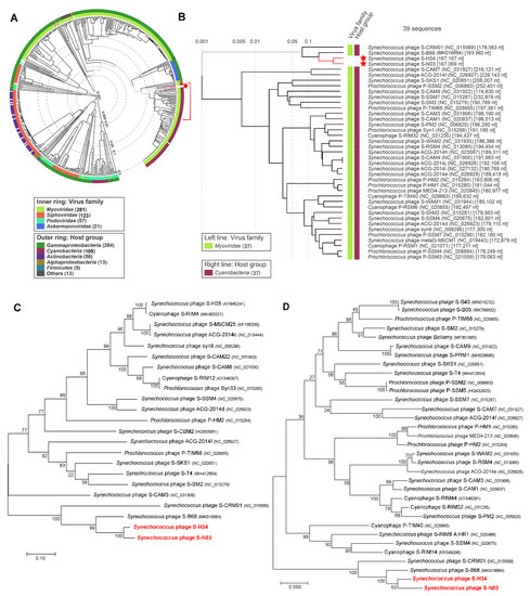 Comparative genome analysis was undertaken to reveal the divergence of the nucleotide sequence of S-N03 and S-H34 from other cyanophages. The “proteomic tree”, based on the genome-wide similarities, showed that the phages with the closest phylogenetic relationship to S-N03 and S-H34 all belong to cyanomyoviruses (Figure 2A,B). S-N03 and S-H34 have the closest genetic relationship with each other and group into the branch that also contains S-B68 and S-CRM01 and are distant from other cyanophages. The phylogenetic analyses of S-N03, S-H34 and other selected dsDNA viruses, based on the DNA polymerase and terminase large subunit sequences using the maximum likelihood method (ML), showed similar branching positions of S-N03 and S-H34 (Figure 2C,D). They share a highest similarity to each other with a nucleotide identity of 84.21% (coverage rate 67.81%). In this cluster, a lower similarity of S-N03 and S-H34 was obtained to S-B68 (identity of 70.54% and 72.18%, respectively) and S-CRM01 (identity of 63.71% and 64.76%, respectively), indicating that S-N03 and S-H34 are novel cyanophages.