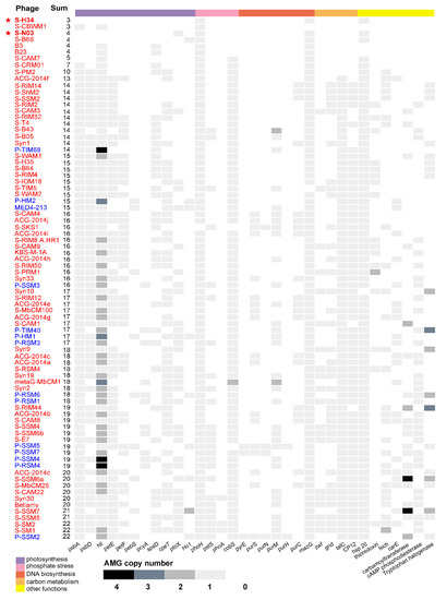 AMGs are commonly found in the genome of cyanophages. Among 81 cyanomyoviruses with available complete genomes, 92.6% are found to contain more than 5 AMGs (Figure 3). However, the newly isolated cyanophage S-N03 contains only 4 AMGs (hsp, MazG, ptoX, phoH) and S-H34 contains only 3 AMGs (hsp, MazG, phoH). The latter one is the phage with the least number of AMGs genes isolated so far (Figure 3). All of the AMGs found in S-N03 and S-H34 genomes are highly conserved genes among cyanophages.