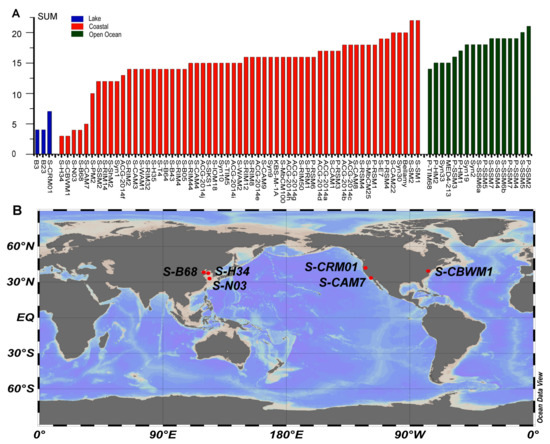 (A) A histogram showing the distribution of AMG content in 81 cyanomyoviruses from different type of habitat (coastal areas, open oceans and lakes). (B) The isolation sites of the published cyanophages with AMGs content less than 10.