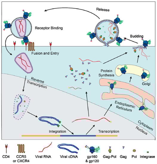 - Popov, S.; Rexach, M.; Zybarth, G.; Reiling, N.; Lee, M.A.; Ratner, L.; Lane, C.M.; Moore, M.S.; Blobel, G.; Bukrinsky, M. Viral protein R regulates nuclear import of the HIV-1 pre-integration complex. EMBO J. 1998, 17, 909–917. [Google Scholar] [CrossRef]