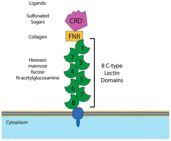 Mannose receptor (MR) is a multidomain, multifunctional pattern-recognition receptor that is highly expressed on macrophages and a handful of other cell types, including dendritic cells and epithelial cells [105,106]. It is a type I transmembrane protein composed of an N-terminal cysteine rich domain, which binds sulfonated sugars [107]; a fibronectin type II domain, which binds collagen [108,109]; and eight C-type lectin domains, which bind mannose and several other hexoses (Figure 2). When the domains are tested in isolation, lectin domain 4 has by far the highest affinity for mannose, but when multiple domains are tested together, a fragment containing domains 4–8 has higher binding affinity still, indicating that binding is multivalent [110,111]. That multiple MR domains can bind the same ligand simultaneously is also supported by the observation that MR has higher affinity for multiply branched polysaccharides than linear ones [112].