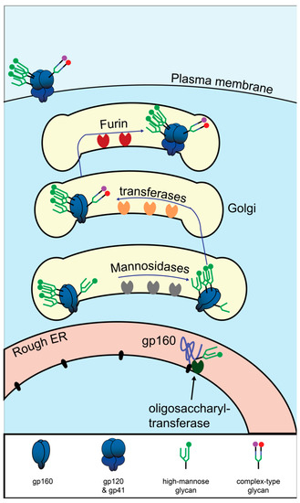Env is a large and structurally complex protein which must be produced in the secretory pathway, where it undergoes numerous post-translational modifications (Figure 3). It is a type 1 transmembrane protein, meaning it has an N terminus facing the lumen/extracellular space, a single transmembrane domain, and a C terminus in the cytosol. Env is translated in the lumen of the rough ER, where it is simultaneously glycosylated at numerous asparagine residues [130]. At each of these residues, the enzyme complex oligosaccharyltransferase attaches a glycan tree [131] that is identical for all asparagine-linked (N-linked) glycosylation sites (Figure 4A). In the ER, glucose is removed from the glycan tree, leaving three branches that all terminate in multiple mannose residues (Figure 4B). This form is called oligomannose, Man5-9GlcNAc2, or high-mannose [132].