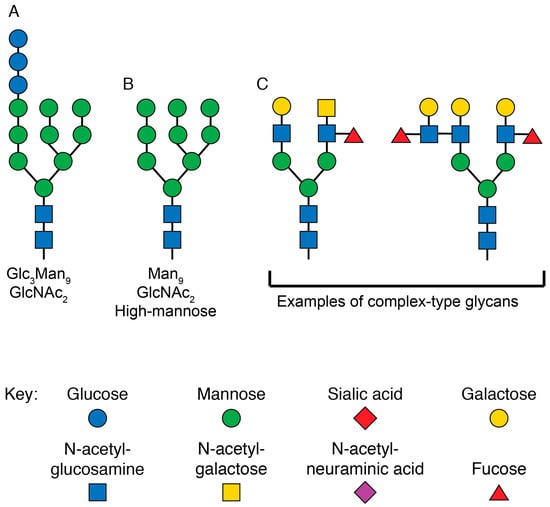 As most glycoproteins transit through the Golgi, the terminal mannose residues are removed by mannosidases [134]. These are replaced by many possible sugar conformations composed of fucose, galactose, sialic acid, and N-acetylglucosamine [135], which are collectively known as “complex glycans” (Figure 4C).
