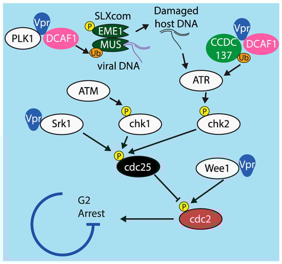 There is significant evidence that Vpr also arrests the cell cycle via the other regulator of cdc2 activity, cdc25. During the normal cell cycle, tyrosine residues on cdc2 are de-phosphorylated by the phosphatase cdc25. Vpr has been shown to inhibit cdc25, leading to hyperphosphorylation of cdc2 [174]. Moreover, cdc25 is under the control of at least three upstream kinases: chk1, which is in turn controlled by ATM; chk2, which is controlled by ATR; and Srk1, which is activated by various stress responses [175]. Of these, only ATM is definitively not involved in Vpr-mediated arrest [174]. One study found that Srk1 is directly bound by Vpr, which increases Srk1-mediated phosphorylation of cdc25. This reduces cdc25 activity and prevents de-phosphorylation of cdc2 [176].