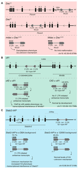 Figure 1. Schematics for the insertion sites of endogenous retroviruses (ERVs) subject to strain-specific regulation (upper panel) and the effects of strain-specific modifier activity (lower panel) for (A) Dac1j and Dac2j, (B) clf1, and (C) Stab2-IAP. Sticks with closed circles represent methylated CpGs in the long terminal repeat (LTR) of the ERV; sticks with open circles represent unmethylated CpGs. Black dotted lines depict introns; thick black lines depict intergenic regions. The information is based on the latest patch release of the 2011 mouse assembly on the UCSC Genome Browser (GRCm38.p6); the coordinates given are mm10.