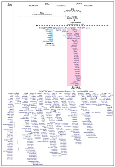 Figure 2. The mapped intervals of four strain-specific ERV modifiers—Mdac, Clf2, Snerv1 and Snerv2 and Stab2-modifier—on Chromosome 13. The underlying genes are separated into Krüppel-associated box domain zinc-finger protein (KRAB-ZFP) genes and non-KRAB-ZFP genes; the KRAB-ZFP clusters are highlighted and named as in [59]. Multiple isoforms are not shown.