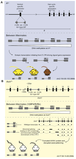 Figure 3. Schematics depicting the insertion sites of the metastable epialleles (A) Avy and (B) AxinFu. Upper panel shows the intracisternal A-type particle (IAP) insertion relative to the affected gene; lower panel shows the functional consequence of the variably methylated IAP element. Coordinates are mm10. Sticks with closed circles represent methylated CpGs in the LTR of the ERV; sticks with open circles represent unmethylated CpGs. Black dotted lines depict introns; thick black lines depict intergenic regions.
