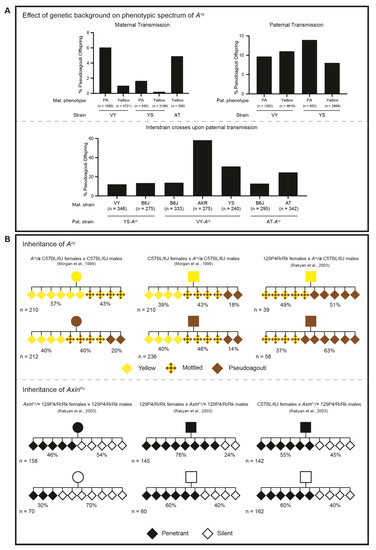 Figure 4. The effect of genetic background on the phenotypic spectrum and inheritance of Avy upon maternal or paternal transmission. (A—upper) Maternal and paternal transmission of the Avy allele on VY/Wf (VY), YS/ChWf (YS), or AT/Wf (AT) genetic backgrounds. The percentage of pseudoagouti (PA) offspring depends upon the maternal coat colour phenotype, but not the paternal coat colour phenotype. Paternal transmission of Avy results in a higher percentage of PA offspring than the maternal transmission of Avy. Both maternally and paternally transmitted alleles are sensitive to genetic background effects, albeit in different ways. (A—lower) Paternal transmission of Avy is largely influenced by the genetic background of the dam. Paternal coat colour information is not included, as it is not available for all of the inter-strain crosses. B6J = C57BL/6J; AKR = AKR/LwNIcr. The data shown in the upper and lower panel are combined (based on the genotype and parent-of-origin) and adapted from [87,89,90]. (B—upper) On a C57BL/6J background, the maternal coat colour phenotype influences the coat colour of the Avy/a offspring, but the paternal coat colour phenotype has no effect on the phenotypic distribution of the offspring. When the Avy allele is paternally inherited through a 129P4/RrRk-fertilised oocyte, the paternal coat colour phenotype influences the coat colour of the Avy/a offspring; the percentage of PA and mottled is increased after passage through a 129P4/RrRk-fertilised oocyte compared to a C57BL/6J-fertilised oocyte. (B—lower) On a 129P4/RrRk background, the maternal and paternal tail kink phenotype influences the tail kink phenotype in the AxinFu/+ offspring. The phenotypic distributions are different upon the maternal versus paternal transmission of the allele. When the AxinFu allele is paternally inherited through a C57BL/6J-fertilised oocyte, the tail kink phenotype of the sire has no bearing on the phenotypic distribution in the AxinFu/+ offspring. The data shown in the upper and lower panel are adapted from [80,83]. Pedigrees: circle—female; square—male; diamond—unspecified.