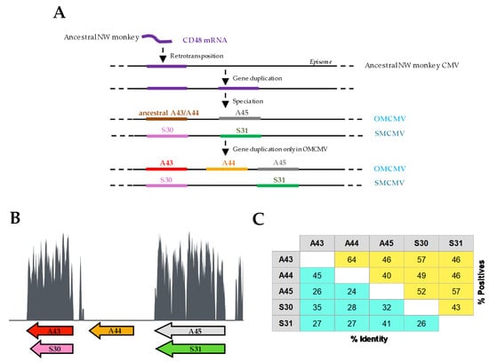 Evolution and diversity of the vCD48 family. (A) Schematic representation of the predicted evolution of the vCD48 gene family. (B) Sliding window plot of the nucleotide conservation along the vCD48 genomic region between owl monkey cytomegalovirus (OMCMV) and squirrel monkey CMV (SMCMV). Bottom arrows annotate the location of the members of this gene family. A sliding window of 30 nt was used to calculate the plot from a nucleotide alignment obtained using MAFFT. (C) Percentage of amino acid identity and similarity (positives) between the vCD48 proteins encoded by these CMVs. These percentages were calculated for each pair of amino acid sequences using BLAST (Global Align option) adjusting the values after removing the positions with gaps.