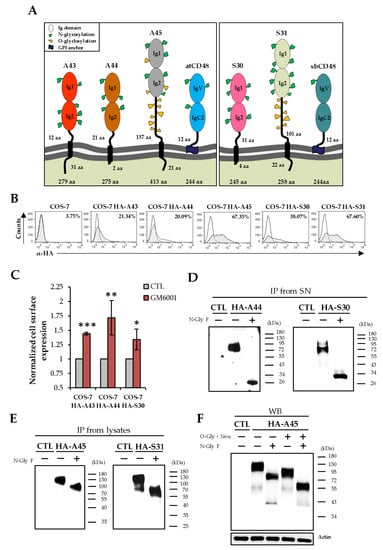 Immunoprecipitations were performed on COS-7 cells non-transfected or transfected with HA-A45 or HA-S31, surface-labeled with biotin (Sigma-Aldrich) and lysed, or on concentrated supernatants of COS-7 cells non-transfected or transfected with HA-A44 or HA-S30. Samples were precleared three times for 30 min using protein G Sepharose (GE Healthcare, Chicago, IL, USA) and immunoprecipitated by incubation with anti-HA-agarose conjugate (Sigma-Aldrich). Immunoprecipitates were washed and eluted. Samples from total cell extracts were lysed and quantified by a BCA Protein Assay Kit (Thermo Fisher Scientific). When indicated, immunoprecipitates or lysed samples were treated with the N-glycosidase F deglycosylation kit or/and an O-glycosidase and neuraminidase bundle (New England BioLabs, Ipswich, MA, USA) following the manufacturer’s instructions. Samples from untreated or treated immunoprecipitates or total cell extracts were subjected to SDS-PAGE in 10% acrylamide gels and subsequently transferred to nitrocellulose membranes (Protran, Merck Millipore). Membranes were incubated with streptavidin-POD conjugate (Roche, Basel, Switzerland) when analyzing HA-A45 or HA-S31 immunoprecipitates, or rabbit anti-HA mAb (clone c2974; Cell Signaling MP) followed by anti-rabbit IgG-POD (Promega) when examining the rest of the samples. As a loading control, an anti-actin mAb (clone C4; MP Biomedicals, Irvine, CA, USA) was employed, followed by anti-mouse IgG-POD (Sigma-Aldrich). Blots were developed using a SuperSignal® West Pico Chemiluminescent Substrate (Pierce, Thermo Fischer Scientific) according to the manufacturer’s protocol.