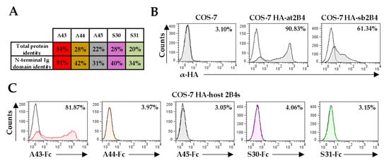 Analysis of the binding capacity of A44, A45, S30, and S31 to host 2B4. (A) Amino acid identity between each vCD48 and host CD48. The percent amino acid identity for the complete sequence or the N-terminal Ig domain sequence of each vCD48 compared to those of the corresponding host CD48 is shown. (B) Flow cytometry analysis of COS-7 cells non-transfected or transfected with HA-at2B4 or HA-sb2B4 and stained with α-HA mAb (shaded histograms) or an isotype control (open histograms). The percentage of positive cells is indicated in each histogram. (C) Interactions of vCD48s with host 2B4. COS-7 cells transfected with each host 2B4 as indicated in B were incubated with 8 µg/mL of A43-Fc, A44-Fc, or A45-Fc in the case of HA-at2B4 transfected cells or S30-Fc and S31-Fc in the case of HA-sb2B4 transfected cells and then analyzed by flow cytometry (shaded and colored histograms). Open histograms represent isotype controls. The percentage of positive cells is indicated in each histogram.