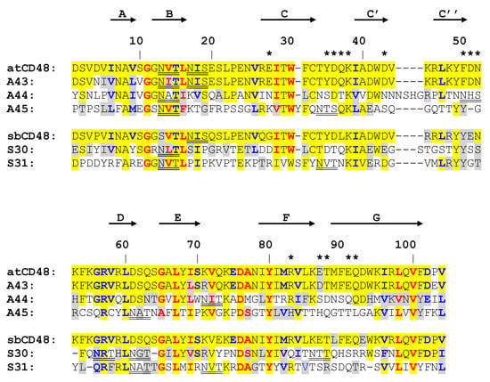 Alignment of the N-terminal Ig domains of vCD48s and host CD48s. The predicted β-strands are depicted with arrows at the top and labeled using the standardized nomenclature for Ig-like domains: A, B, C, C’, C’’, D, E, F, and G. Potential N-linked glycosylation sites are double underlined. Conserved residues (with respect to CD48) are shaded in yellow (identical amino acid) or light gray (similar amino acid). Amino acids colored in bold red are conserved between most members of the Ig superfamily; those colored in bold blue are conserved between most SLAM family receptors. Contacting residues in the 2B4:CD48 heterophilic dimer are marked using black stars above the atCD48 sequence.