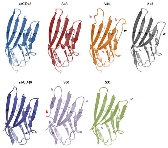 Predicted tertiary structure of host CD48s and vCD48s. β-strands are shown as arrows labeled as in Figure 5. The absence of the predicted C’’ β-strands in A44 and A45 is indicated by black arrows, the truncated G β-strand in S30 by a red arrow, and the different CC’, C’C’’ or C’D, and FG loops in the vCD48s as compared to host CD48s by pink arrows.