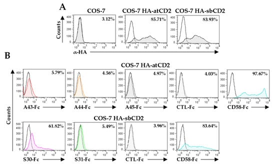 Analysis of the binding capacity of A44, A45, S30, and S31 to host CD2. (A) Flow cytometry analysis of COS-7 cells non-transfected or transfected with HA-atCD2 or HA-sbCD2 and stained with α-HA mAb (shaded histograms) or an isotype control (open histograms). The percentage of positive cells is indicated in each histogram. (B) Interactions of vCD48s with host CD2. COS-7 cells transfected with either HA-atCD2 (upper panels) or HA-sbCD2 (bottom panels) were incubated with 8 µg/mL of A43-Fc, A44-Fc, A45-Fc, S30-Fc, S31-Fc, atCD58-Fc, or an unrelated CTL-Fc fusion protein, as indicated, and then analyzed by flow cytometry (shaded and colored histograms). Open histograms represent isotype controls. The percentage of positive cells is indicated in each histogram.