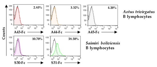 Analysis of the binding capacity of vCD48s to Epstein–Barr virus (EBV)-immortalized B lymphocytes. EBV-immortalized Aotus trivirgatus (top panels) or Saimiri boliviensis (bottom panels) B lymphocytes were incubated with 8 µg/mL of each of the indicated vCD48-Fc fusion protein and analyzed by flow cytometry (shaded and colored histograms). Open histograms represent isotype controls. The percentage of positive cells is indicated in each histogram.