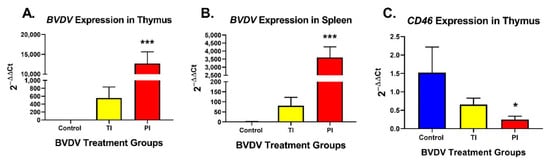 Bovine Viral Diarrhea Virus (BVDV) expression in (A) thymus and (B) spleen samples (Control, TI, and PI). Expression of BVDV was significantly upregulated in PIs compared to controls in both thymic and splenic samples. Expression of BVDV in TIs was higher than controls, but not significant due to individual variation. (C) BVDV receptor CD46 expression in thymus (Control, TI, and PI). CD46 expression was significantly down-regulated in PI thymuses. Control: Uninfected, blue; TI: Transiently Infected, yellow; PI: Persistently Infected, red. * p < 0.05, *** p < 0.001.
