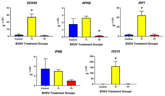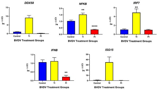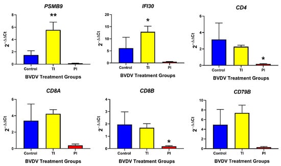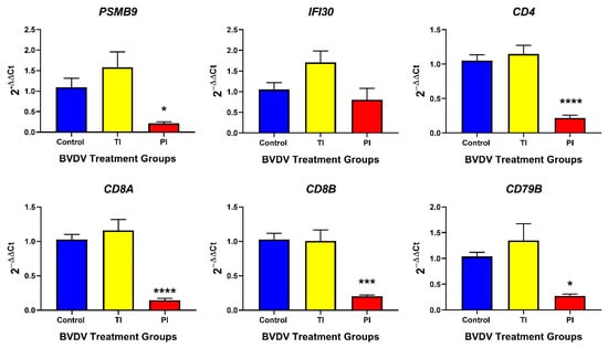 RT-qPCR targets for each tissue were chosen based on current knowledge and available tissue. Targets shared between the thymus and spleen were chosen to understand basic changes in both the innate and adaptive branches of the immune system. For the innate immune branch, targets chosen were DDX58, NFKB, IRF7, IFNB, and ISG15. For the adaptive branch, targets chosen were PSMB9, IFI30, CD4, CD8A, CD8B, and CD79B. Thymic tissue samples were more abundant than the spleen, allowing for additional targets to be studied in the thymus; STAT1, IFI6, CXCL10, CXCL16, CXCR6, TAP1, B2M, CIITA, and CD46. These results can be found in Table A1. A previous study which used a microarray to study BVDV-infected spleens indicated STAT4 and PSMB8 as targets of interest specific for splenic samples []. Therefore, both STAT4 and PSMB8 were additional targets for splenic samples in this study. BVDV viral RNA was also targeted to confirm tissue infection in TI and PI fetuses. These results can also be found in Table A1. Standard RT-qPCR primers were validated and evaluated based on MIQE guidelines [].