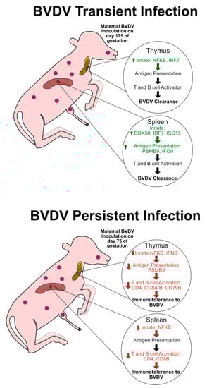 Graphic summarizing significant changes in fetal immune responses based on type of infection and tissue, as interpreted by RT-qPCR analysis. BVDV transient infection represents a fetal infection after gestational day 160 in which the fetus is able to clear the virus. Trends include an upregulation in genes associated with the innate immune response. Day 190 of collections may have been too early to capture an adaptive immune response in TI fetuses. However, we hypothesize that these pathways contribute to BVDV clearance in TI animals. BVDV-persistent infection represents a fetal infection before gestational day 120 in which the fetus is unable to clear the virus. Trends include a drastic down-regulation of the innate and adaptive branches of the immune system, and may lead to immunotolerance of the fetus to BVDV. In future studies, TI BVDV clearance and PI immunotolerance will be studied further with protein targets and flow cytometry. Green text, up arrow left of text, and listed genes represent pathways and genes which were significantly upregulated, as determined by RT-qPCR. Red text, down arrow left of text, and listed genes represent pathways and genes which were significantly downregulated as determined by RT-qPCR.