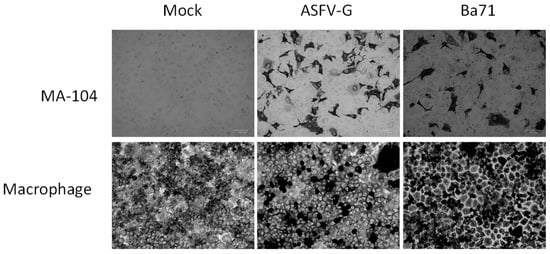 Hemadsorption (HA) is the ability of ASFV-infected cells to form rosettes in the presence of swine red blood cells, and it is an easy visual test for detecting infectious ASFV in cell cultures. Twenty-four after infected with either ASFV-G or BA71, both MA-104 cells and primary swine macrophages cells were observed for hemadsorption (HA) as an indicator of the presence of ASFV-infected cells (Figure 1). Results demonstrate that ASFV-infected MA-104 cells form rosettes with a very similar phenotype to those rosettes that are typically observed in infected macrophages [11,12,13].