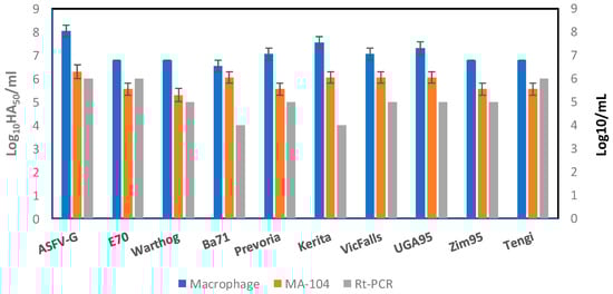 Comparison of the titration of African Swine Fever Virus (ASFV) isolates in swine macrophages (blue) or MA-104 (orange) cells with real-time PCR. Titrations are expressed in log10 HA50/mL, the error bars are the standard deviation between replicates, and rt-PCR is expressed as L]log10/mL, indicating the last dilution that had a positive CT value for ASFV.