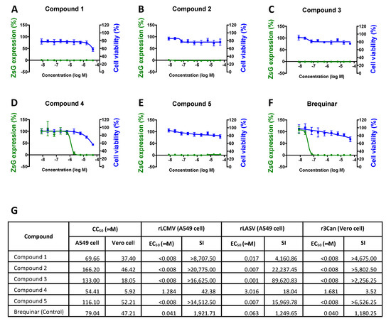 We investigated the dose-dependent effects of five novel DHODH inhibitors (i.e., Cmp 1, Cmp 2, Cmp 3, Cmp 4, and Cmp 5) on rLCMV/ZsG multiplication, cell viability, and in vitro hDHODH inhibition (Figure 1 and Figure 8). A549 cells were treated with three-fold serial dilutions of each compound. At 2 h post-treatment, cells were infected with rLCMV/ZsG (MOI = 0.01) and at 48 h pi, ZsG expression levels were determined, as described in the Materials and Methods section. Normalized ZsG expression levels were used to determine EC50 values. Cell viability was determined by formazan production, and values were normalized for CC50 calculation. Brequinar, a known DHODH inhibitor [44,45,46], was used as a control (Figure 1F). All tested DHODH inhibitors also strongly inhibited rLASV/GFP and rCan/GFP multiplication with high SI values (Figure 1G).