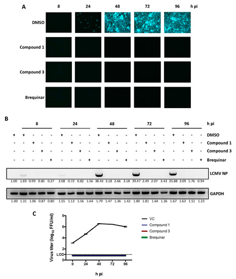 For growth kinetics, virus was added to cells (200 µL/well in a 24-well plate) at the indicated multiplicity of infection (MOI). After 90 min of adsorption, virus inocula were removed, cells were washed twice with DMEM and 2% FBS, and fresh media containing the indicated compounds and concentrations were added. At the indicated hours post-infection (pi), tissue culture supernatants (TCSs) were collected and viral titers were determined using a focus-forming assay (FFA) [38]. For EC50 determination, cells were plated on 96-well clear-bottom black plates (2.0 × 104 cells/well) and incubated for 20 h at 37 °C and 5% CO2. Cells were pre-treated for 2 h before infection with three-fold serial dilutions of each compound. Cells were infected (MOI = 0.01) with rLCMV/ZsG-P2A-NP in the presence of compounds. At 48 h pi, cells were fixed with 4% paraformaldehyde, nuclei were stained with 4′,6-diamidino-2-phenylindole (DAPI), and ZsG expression was determined by fluorescence using a fluorescent plate reader (Synergy H4 Hybrid Multi-Mode Microplate Reader, BioTek, Winooski, VT, USA). Mean relative fluorescence units were normalized with the vehicle control group (DMSO), which was adjusted to 100%. ZsG expression was normalized for total cell protein in lysate (Pierce BCA Protein Assay Kit, ThermoFisher Scientific). EC50 was determined using Prism. SIs for hit compounds were determined using the ratio CC50:EC50.