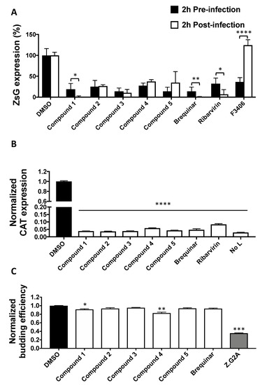 The luciferase-based budding assay was performed as described [40]. Briefly, 293T cells were seeded on poly-L-lysine-coated 12-well plates (3.5 × 105 cells/well). After overnight incubation, 2 µg of DNA of either pC-LASV-Z-Gaussia luciferase (GLuc) or pC-LASV-mutant Z[G2A]-GLuc were transfected using Lipofectamine 2000 (2.5 µL/µg of DNA). After 5 h, transfection mixtures were replaced with fresh media containing the indicated hit compounds. After 48 h, TCSs containing virion-like particles (VLPs) were harvested and clarified by low-speed centrifugation to remove cell debris. Aliquots (20 µL each) from TCS samples were added to 96-well black plates (VWR, West Chester, PA, USA), and 50 µL of SteadyGlo luciferase reagent (Promega) were added to each well. WCLs from the same samples were processed to determine cell-associated activity of GLuc. The luminescence signal was measured using the Berthold Centro LB 960 luminometer (Berthold Technologies, Oak Ridge, TN, USA). The activity (relative light units) of GLuc in TCSs and WCLs was used as a surrogate of Z expression. Budding efficiency was defined as the ratio ZVLP:(ZVLP+ZWCL).
