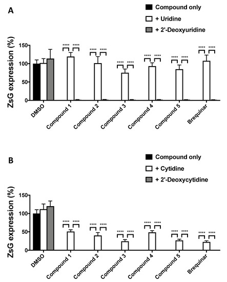 DHODH is a key enzyme in the de novo pyrimidine biosynthesis pathway, and DHODH inhibitors exert their antiviral activity via the depletion of intracellular pyrimidine levels. Accordingly, the antiviral activity of DHODH inhibitors can be reversed by promoting the pyrimidine salvage pathway via supplementation with exogenous pyrimidine ribonucleosides. Treatment of LCMV-infected A549 cells with non-limiting exogenous uridine (Figure 5A) or cytidine (Figure 5B) supplementation reverted completely or partially, respectively, the antiviral effects of DHODH inhibitors. We used 2′-deoxy analogs as negative controls due to their inability to be metabolized for ribonucleotide synthesis.