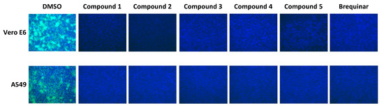 A549 cells were seeded (2 × 104 cells/well) on 96-well clear-bottom black plates and incubated for 20 h at 37 °C and 5% CO2. Cells were treated with each compound (5 µM) at either 2 h prior to or 2 h following infection. Cells were infected (MOI = 0.5) with single-cycle infectious rLCMV∆GPC/ZsG to prevent the confounding factors caused by multiple rounds of infection. At 48 h pi, cells were fixed with 4% paraformaldehyde and nuclei were stained with DAPI. ZsG expression levels were determined using a fluorescent plate reader (Synergy H4 Hybrid Multi-Mode Microplate Reader, BioTek, Winooski, VT, USA). Mean relative fluorescence units were normalized to the vehicle control (DMSO) group, which was adjusted to 100%.