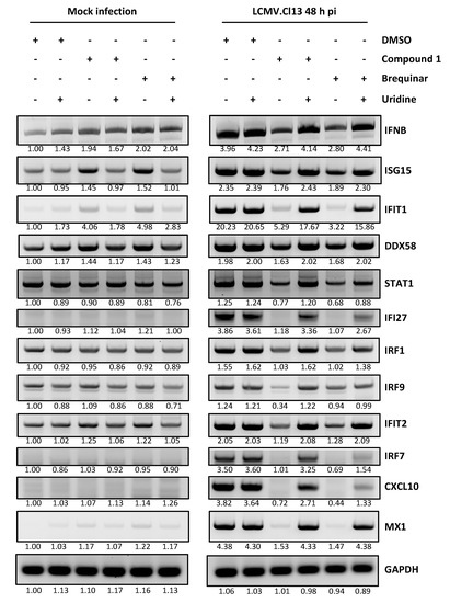 Limited role of pyrimidine depletion-mediated IFN-stimulated genes (ISG) expression on the antiviral activity against LCMV. A549 cells were treated with the indicated DHODH inhibitors (5 µM) and uridine (100 µM), and then incubated for 48 h with or without rCL-13 infection. Total cellular RNA was purified and equal amounts (3.5 µg) were used in reverse transcription reactions using random hexamer primers to generate cDNAs that were used in PCR reactions with specific primers to amplify the cDNAs of indicated genes. PCR products were resolved by agarose gel electrophoresis and visualized by ethidium bromide staining. The number below each band indicates the normalized fold change of band intensity compared to mock-infected and vehicle-treated control cells. Each band intensity was normalized to the corresponding glyceraldehyde 3-phosphate dehydrogenase (GAPDH) band intensity.
