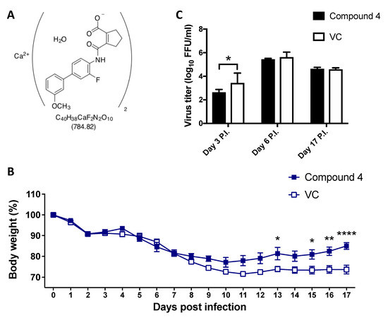 In vivo antiviral activity of Cmp 4 against LCMV. (A) Structural formula of Cmp 4 (IMU90838, also known as vidofludimus calcium). (B and C) C57BL/6 mice (n = 4) were orally treated with Cmp 4 (150 mg/kg/d) for 17 days or with VC. Both groups of mice were infected (IV) with 2 × 106 pfu of CL-13. Body weight changes (B) and serum virus titers (C) were determined at the indicated time points. Statistical significance was calculated by ANOVA (* p < 0.05, ** p < 0.002, and **** p < 0.00001).