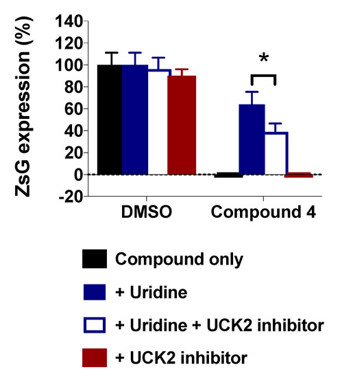 A549 cells were treated with Cmp 4 (5 µM) and with or without uridine or UCK2 inhibitor and infected (MOI = 0.01) with rCL-13/ZsG (six replicates). At 48 h pi, ZsG expression levels were determined. Error bars represent mean +/− SEM. Statistical significance was calculated by ANOVA (* p < 0.05).