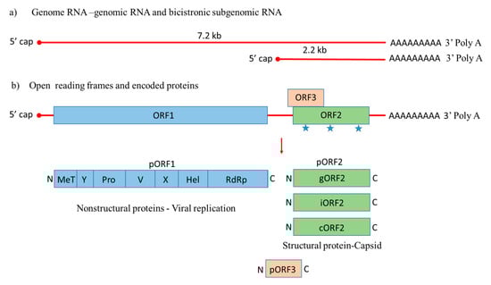 HEV is a quasi-enveloped, icosahedral, single-stranded positive-sense RNA virus that was molecularly characterized for the first time in 1990 [42]. Its genome is around 7.2 kb with features of a eukaryotic mRNA, including a 5′ cap and 3′ poly A tail, 5′ and 3′ untranslated regions (UTRs), and three open reading frames, including ORF1, ORF2, and ORF3 [43]. During HEV genome replication two viral RNA species are generated, i.e., the full-length genomic RNA and a subgenomic RNA [44]. The subgenomic RNA allows the expression of ORF2 and ORF3 (Figure 1).