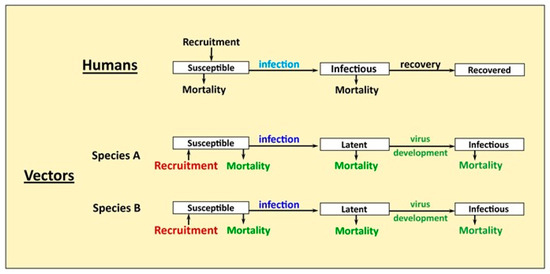 The model structure consists of nine differential equations following changes in susceptible, infected, and recovered humans and susceptible, exposed (latently infected) and infectious mosquitoes of each species (j):