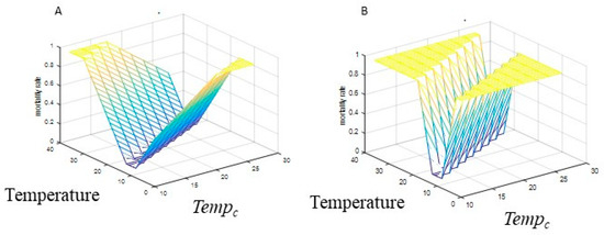 The previous models used a simple linear increase in mortality with temperature over a relatively narrow temperature range. To include a wider temperature range, increases in mortality at colder temperatures needed to be considered. One study showed relatively little change in mortality over a wide temperature range for Ae. aegypti [27], increasing outside the optimal range. Laboratory studies may underestimate mortality, and this study did not extend to temperatures likely to be immediately lethal [27]. The authors fit higher order polynomials to their data, with the best fit with a 4th order polynomial. However, the parameters of this polynomial equation are not easily interpreted biologically. We modeled temperature dependent mortality for both species with a piecewise linear function, resulting in low mortality in an optimal survival temperature range and linear increases on each side. The minimum mortality (µmin, j) and slope with respect to temperature (µsl,j) varied separately for each species (j = [1, 2]) but the center of the optimum survival temperature range (Tempc) did not. The optimum survival range was narrow (Tempc ± W; W = 2 °C) to allow more variation in the slope while still reaching high levels of mortality (Figure 2). The mortality rate was bounded (µmin, 1) although the maximum of 1 may not be reached under all parameter combinations. Thus,