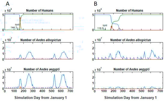 Change in behavior with Tempc. Other parameter values as for Figure 3A. (A) Tempc = 16 °C. (B) Tempc = 10 °C; compare to Figure 2A. Decreasing Tempc changes model behavior from rapid single outbreak to bimodal outbreak, then delayed single outbreak. Blue lines, susceptible; red lines, infectious humans or mosquitoes; and green lines, recovered humans.