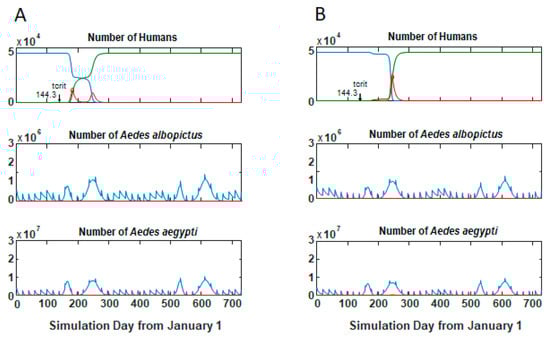 - Manore, C.A.; Hickmann, K.S.; Xu, S.; Wearing, H.J.; Hyman, J.M. Comparing Dengue and Chikungunya emergence and endemic transmission in A. aegypti and A. albopictus. J. Theor. Biol. 2014, 356, 174–191. [Google Scholar] [CrossRef]