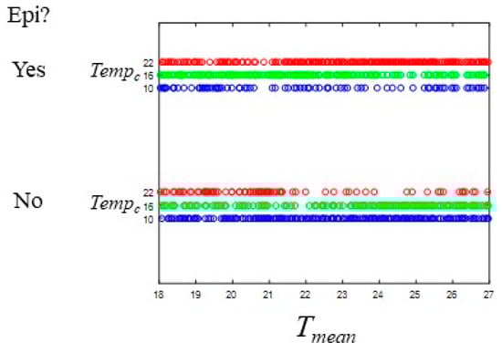 Relationship between epidemic occurrence and mean annual temperature (Tmean). All three values of Tempc shown (22 °C, red; 16 °C, green; 10 °C, blue). Top set, epidemic occurred; bottom, no epidemic. Each point is one simulation plotted for the Tmean from that run set. Other parameters varied in the LHC sampling scheme. Epidemics were more likely at Tempc = 22 °C and with higher values of Tmean.
