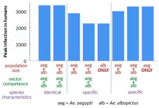 Baseline model runs with species characteristics set identically (functionally one large population) showed identical outbreak sizes regardless of the vector competence assigned to each population and the relative population sizes (Figure 6). When species-specific parameters are used, an aegypti-adapted strain shows the same outbreak sizes with only Ae. aegypti populations and with Ae. aegypti-dominated populations. Equal population sizes of both vectors reduces outbreak size slightly. However, with an albopictus-adapted strain (in transmission parameters only), a different pattern is observed. Highest outbreak sizes are lower than those observed with identical species characteristics or with aegypti-adapted virus strains, and increasing the proportion of Ae. albopictus in the population further decreases outbreak size.