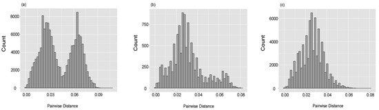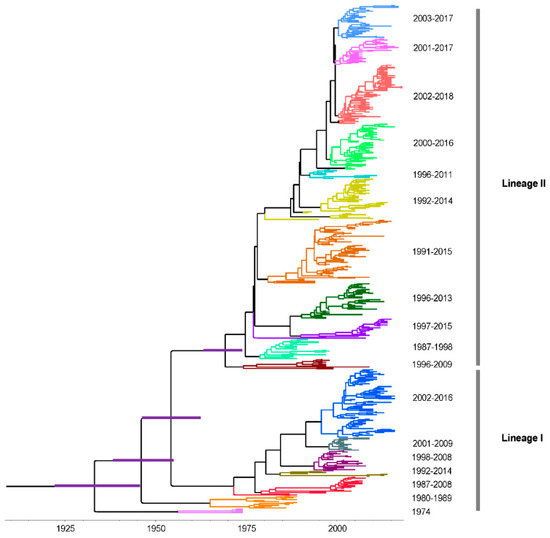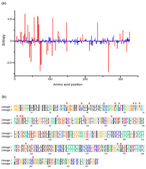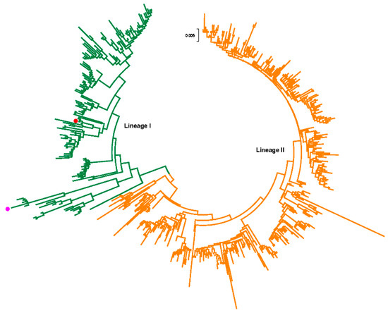 - Rambaut, A.; Lam, T.T.; Max Carvalho, L.; Pybus, O.G. Exploring the temporal structure of heterochronous sequences using TempEst (formerly Path-O-Gen). Virus Evol. 2016, 2, vew007. [Google Scholar] [CrossRef] [PubMed]
