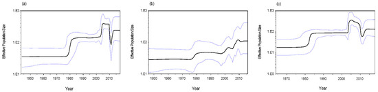 - Drummond, A.J.; Rambaut, A.; Shapiro, B.; Pybus, O.G. Bayesian coalescent inference of past population dynamics from molecular sequences. Mol. Biol. Evol. 2005, 22, 1185–1192. [Google Scholar] [CrossRef]