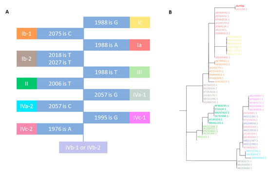 Graphical representation of BKTyper VP1 genotyping and phylogeny block identification. Subpanels (A) and (B) represent the different steps of the algorithm. (A), decision tree to genotype VP1 from Morel et al. [13]. Blue boxes represent coordinates for specific positions from the polyomavirus BK Dunlop strain (V01108.1) reference and the nucleotide that needs to be present to stop the decision tree. If true, the subgroup corresponds to the contiguous colored box. If another nucleotide is found at the given position, the following colored box must be checked. (B), ML phylogenetic tree that corresponds to the typing of a Dunlop strain VP1 with the internal database of BKTyper. Colors represent the different subtypes (shared in panel A). Query sequence “dunlop” is highlighted in red.