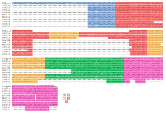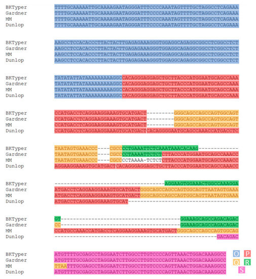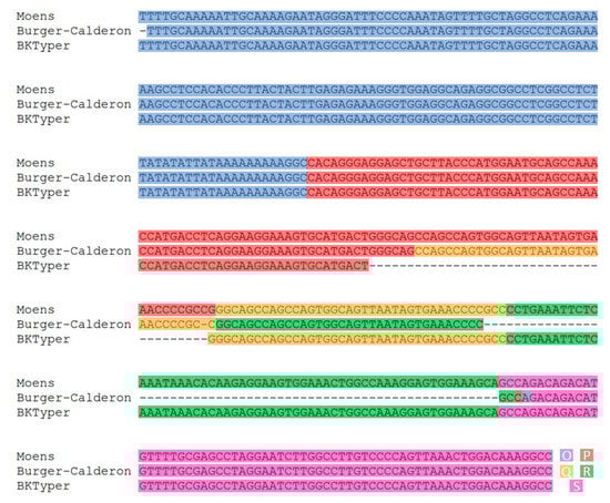 Visual inspection of the NCCR sequence alignment between Moens et al., Burger-Calderón et al., and BKTyper (see Table 1) [7,33]. Editing errors from both Moens et al. and Burger-Calderón et al. are displayed in the alignment. This alignment was constructed by concatenating the different OPQRS NCCR blocks and posteriorly aligned with Mafft [25]. Diverse color underlying has been used to highlight the different blocks (blue for O, red for P, yellow for Q, green for R, and purple for S).